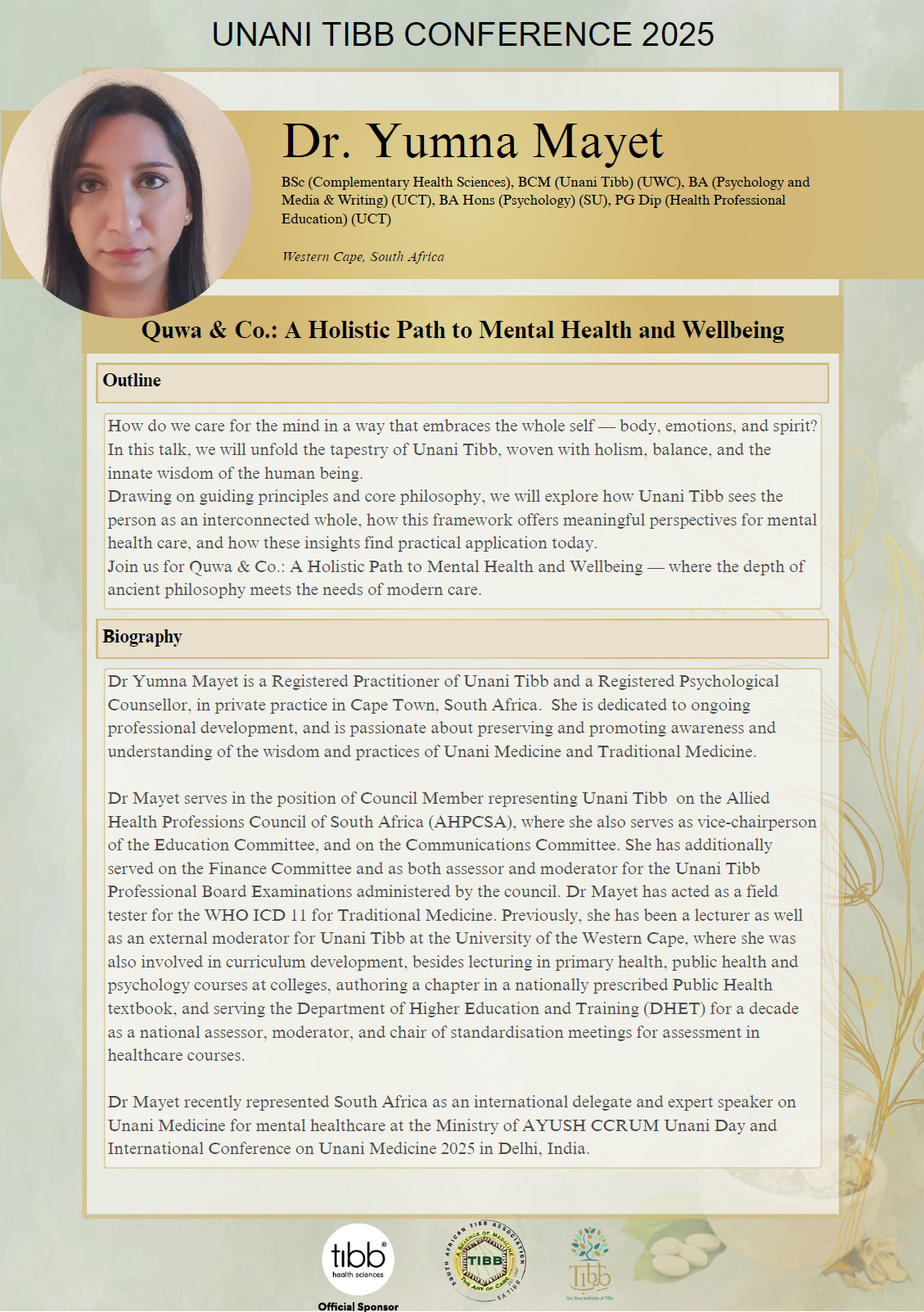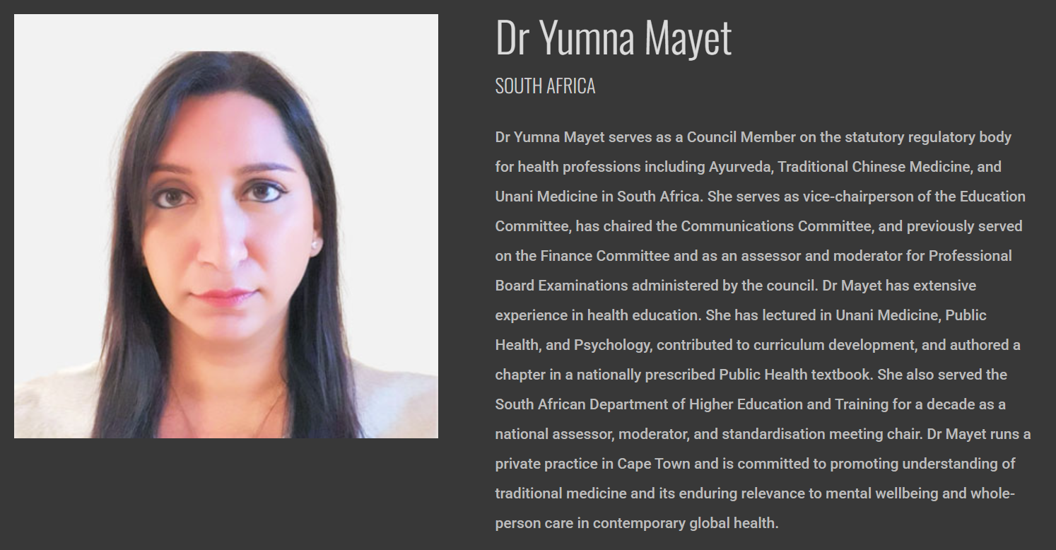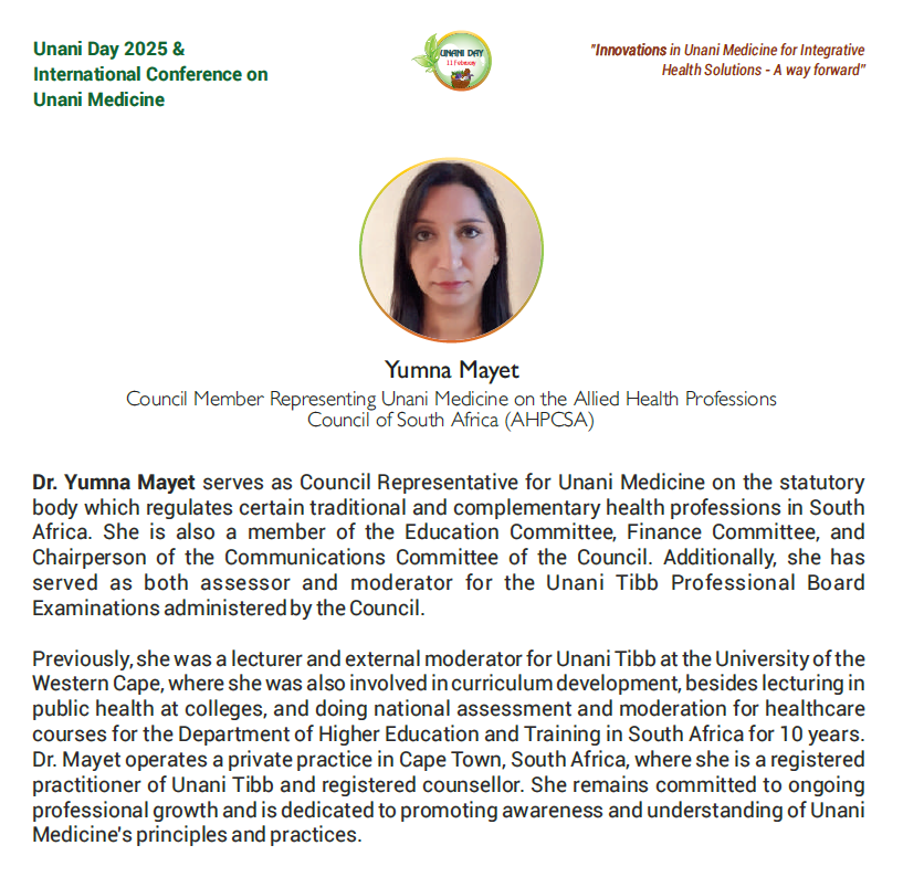 Beyond the consulting room, her work extends into professional education and interdisciplinary dialogue within traditional, complementary, and integrative medicine. Dr Mayet has represented Unani Medicine in national and international forums and has presented on both clinical applications and the responsible integration of traditional systems within contemporary healthcare frameworks.